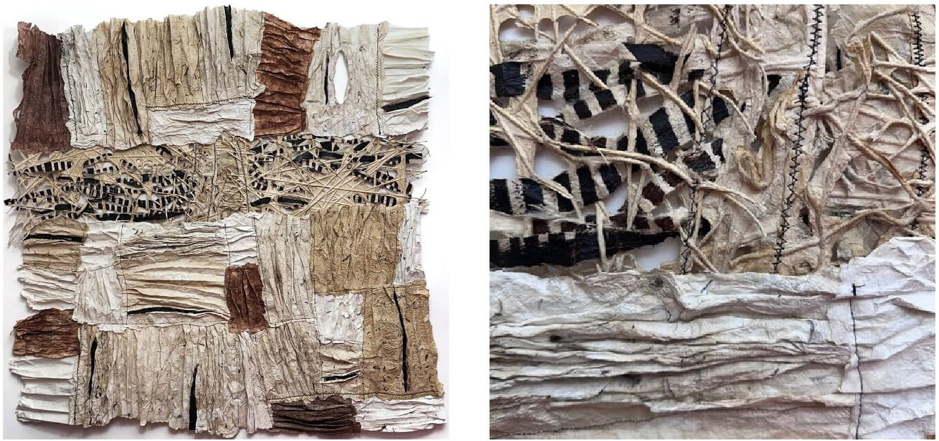 Integration/Segregation, 36 x 36ā, abaca pulp, twine, machine stitching, tea stain, recycled mulberry inked paper, watercolor, dried plant material, sealant.